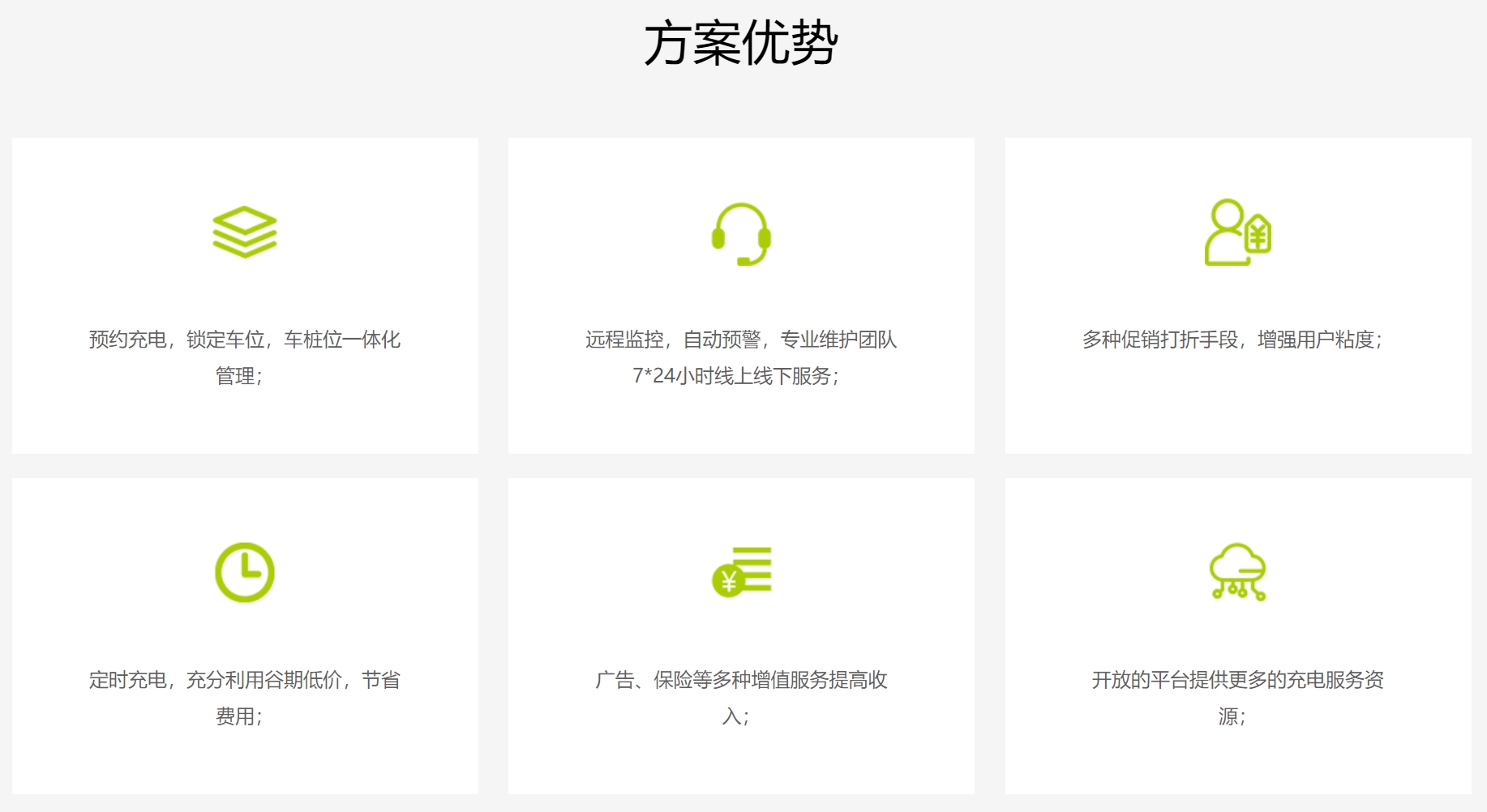住宅小區(qū)充電具有停車充電時(shí)間長(zhǎng),谷期充電需求大和運(yùn)營(yíng)關(guān)聯(lián)單位多的特點(diǎn),充電云平臺(tái)將充電服務(wù)與停車管理、安全監(jiān)控系統(tǒng)相結(jié)合,提供車樁位一體化的管理服務(wù);同時(shí)提供了預(yù)約充電和定時(shí)充電服務(wù),解決了小區(qū)停車難和谷期充電的需求。 物流、出租公共充電站 針對(duì)物流車和出租車流動(dòng)性大、補(bǔ)電急的特點(diǎn),通過(guò)充電云平臺(tái)的開(kāi)放能力提供更廣泛的充電資源,電動(dòng)車主可通過(guò)APP或公眾號(hào),查找附近大功率直流充電設(shè)備為主的公共充電站進(jìn)行快速補(bǔ)電。同時(shí)提供了預(yù)約充電服務(wù),減少充電等待時(shí)間,實(shí)現(xiàn)場(chǎng)站有序充電;通過(guò)云平臺(tái)提供的動(dòng)力、安防監(jiān)控系統(tǒng),專業(yè)維護(hù)團(tuán)隊(duì)7*24小時(shí)線上線下服務(wù),實(shí)現(xiàn)場(chǎng)站無(wú)人值守自動(dòng)化運(yùn)營(yíng)。 公交專用充電站 基于充電云平臺(tái)開(kāi)放架構(gòu),與車輛運(yùn)營(yíng)調(diào)度平臺(tái)、場(chǎng)站停車管理平臺(tái)完美融合,實(shí)現(xiàn)公交科學(xué)排班輪充的全自動(dòng)化處理;研發(fā)專屬公交充電場(chǎng)景應(yīng)用,負(fù)荷臨調(diào),群控群充,定時(shí)充電”優(yōu)化充電業(yè)務(wù)流程、實(shí)現(xiàn)谷期充電降本,多源數(shù)據(jù)分析”為企業(yè)提供多維度運(yùn)營(yíng)、運(yùn)維、財(cái)務(wù)、質(zhì)量、服務(wù)數(shù)據(jù)分析、助力提升運(yùn)營(yíng)效率; 還有更多能源云服務(wù)助力打造綜合性公交充電運(yùn)營(yíng)體系。 商業(yè)地產(chǎn)充電 商業(yè)地產(chǎn)充電具有停車充電時(shí)間長(zhǎng),谷期充電需求大和運(yùn)營(yíng)關(guān)聯(lián)單位多的特點(diǎn),充電云平臺(tái)將充電服務(wù)與停車管理、安全監(jiān)控系統(tǒng)相結(jié)合,提供車樁位一體化的管理服務(wù);同時(shí)提供了預(yù)約充電和定時(shí)充電服務(wù),解決了停車難和谷期充電的需求。 政府公共充電設(shè)施 基于充電云平臺(tái)開(kāi)放架構(gòu),與車輛運(yùn)營(yíng)調(diào)度平臺(tái)、場(chǎng)站停車管理平臺(tái)完美融合,實(shí)現(xiàn)公交科學(xué)排班輪充的全自動(dòng)化處理;研發(fā)專屬公交充電場(chǎng)景應(yīng)用,“負(fù)荷臨調(diào),群控群充,定時(shí)充電”優(yōu)化充電業(yè)務(wù)流程、實(shí)現(xiàn)谷期充電降本,“多源數(shù)據(jù)分析”為企業(yè)提供多維度運(yùn)營(yíng)、運(yùn)維、財(cái)務(wù)、質(zhì)量、服務(wù)數(shù)據(jù)分析、助力提升運(yùn)營(yíng)效率; 還有更多能源云服務(wù)助力打造綜合性公交充電運(yùn)營(yíng)體系。