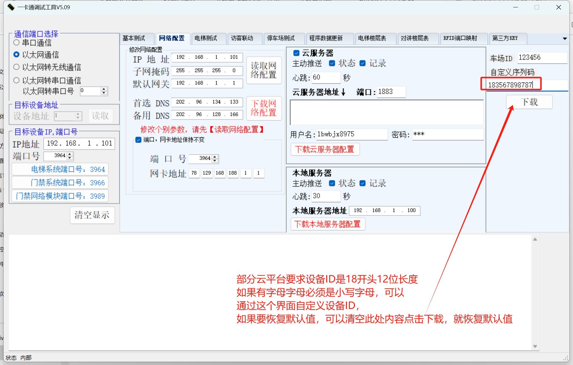 4、倍賀云平臺要求設(shè)備ID是18開頭12位長度,如果有字母字母必須是小寫字母,可以通過這個界面自定義設(shè)備ID,如果要恢復(fù)默認值,可以清空此處內(nèi)容點擊下載,就恢復(fù)默認值。